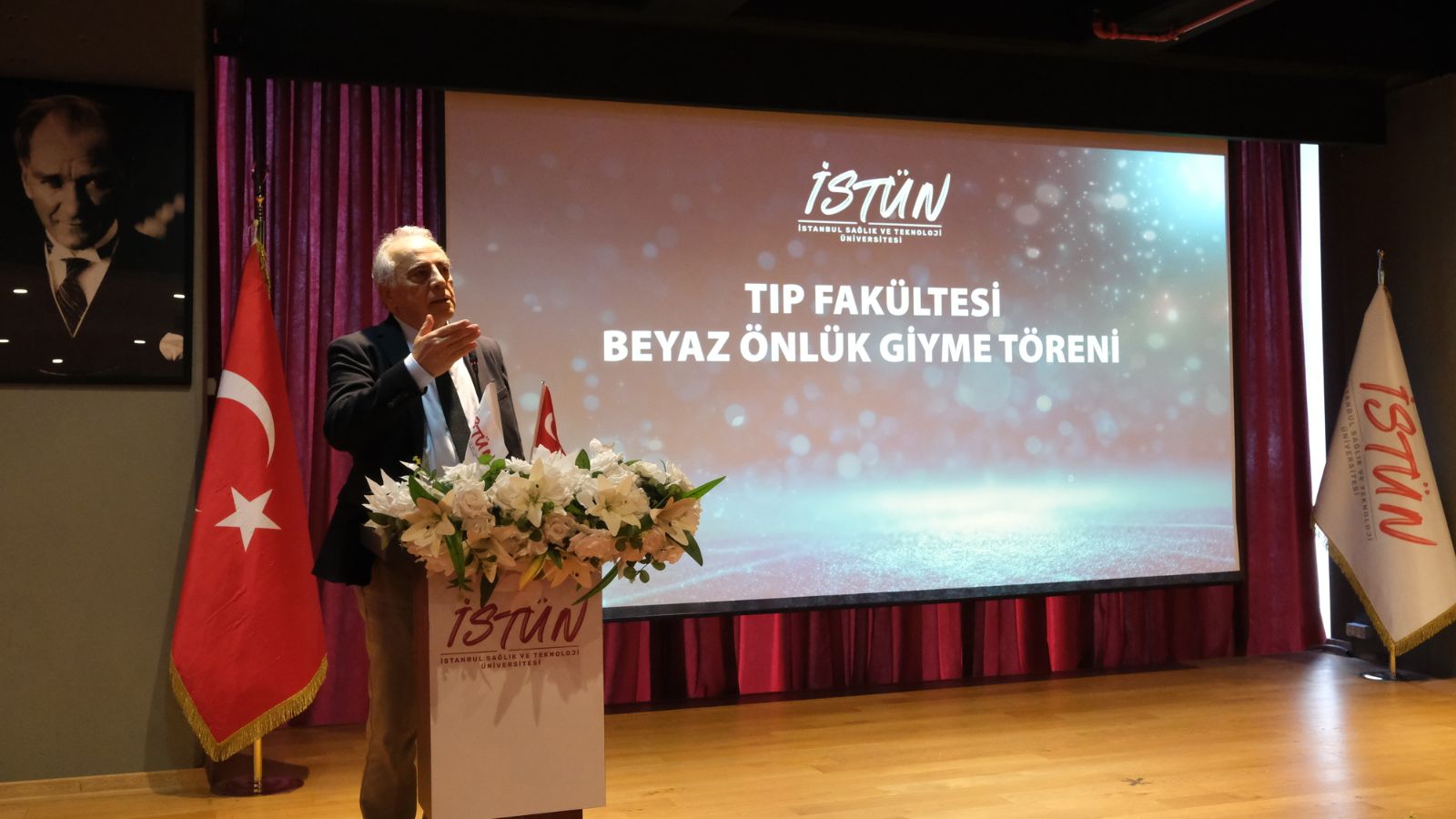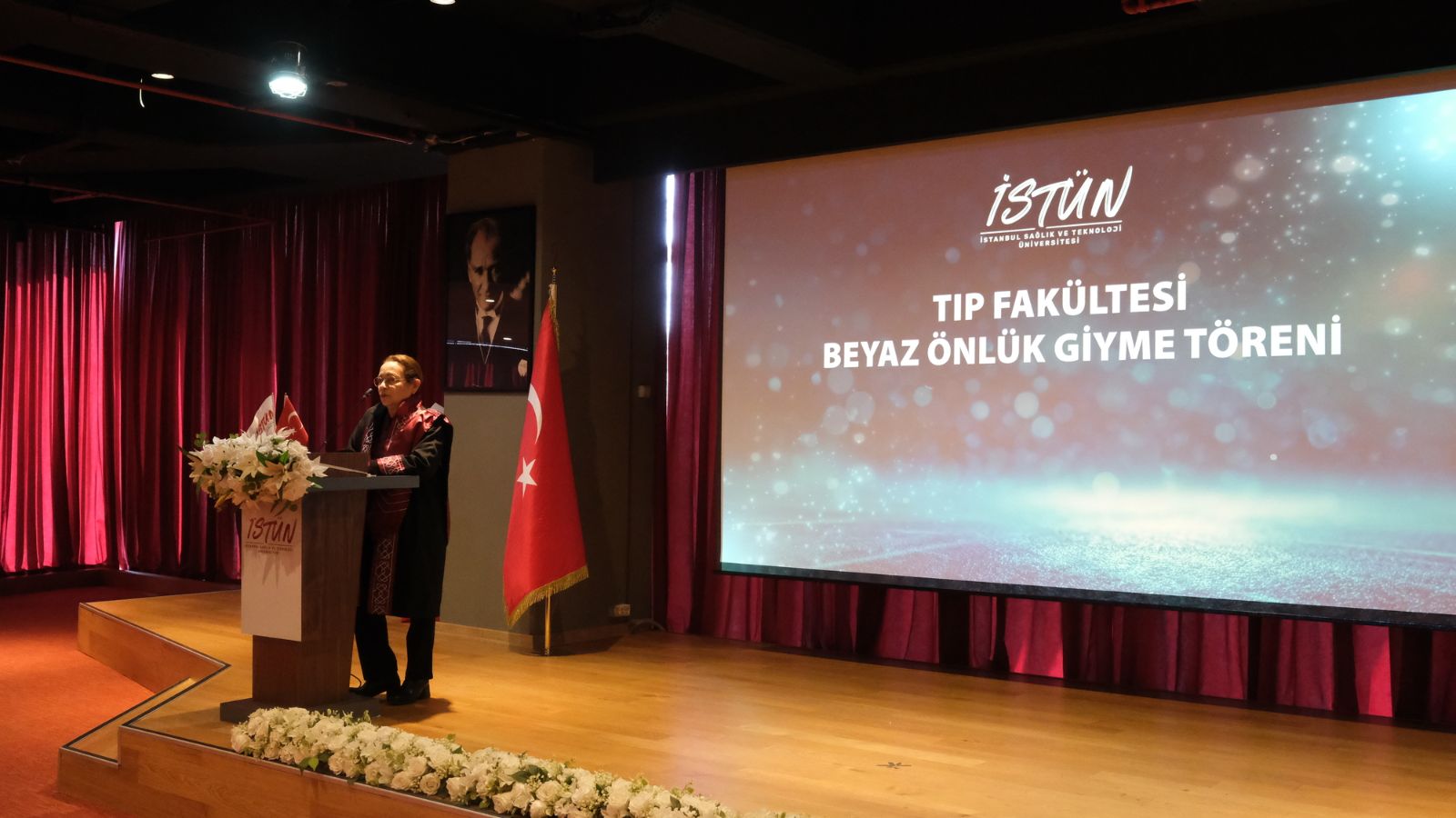 Saygı duruşu ve İstiklal Marşı’nın ardından başlayan törende İstanbul Sağlık ve Teknoloji Üniversitesi Rektörü Prof. Dr. Buğra Özen, rektör yardımcıları ve davetli konuklar öğrencilere hitap etti. Rektör Prof. Dr. Buğra Özen konuşmasında üniversitenin eğitim vizyonuna ve hekimlik mesleğinin taşıdığı sorumluluğa değinerek genç hekim adaylarına önemli mesajlar verdi. Hekimliğin yalnızca bilimsel bilgiyle değil, aynı zamanda güçlü etik değerlerle şekillendiğini vurgulayan Prof. Dr. Özen, konuşmasını Gazi Mustafa Kemal Atatürk’ün “Beni Türk hekimlerine emanet ediniz.” sözüyle tamamladı.